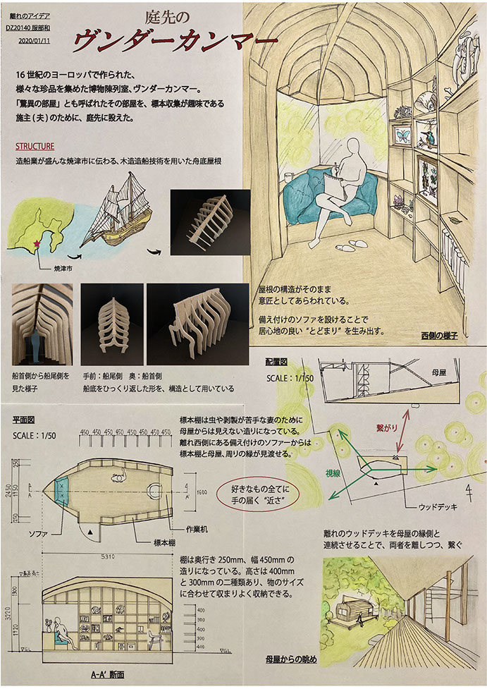 母屋とは独立した小さな建築を“離れ(ハナレ)”と呼ぶ。それは昔から書斎や茶室、陶芸制作のアトリエ等々、少し日常を離れた“趣味の空間”として使われてきた。この課題では、指定された既存の母屋の南側の庭の片隅に、そのような趣味の活動のための“小さな離れ”を設計した。