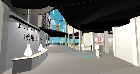 「建築展-会場2-」では、海や山といった周辺環境と調和した建築を仮想空間上で表現した。周辺環境(海や鉄道、背景の山並みまで)と一体的な建築モデルを示すことによって、実際に行ったことがない人も、その場の周辺環境を意識できるようにした。また、仮想空間内での他者とのコミュニケーションについても分析した。空間上でユーザーが自由で気軽にコミュニケーションできるように、チャットログを表示するパネルを配置し、仮想空間上でのコミュニティの場としてデザインした。