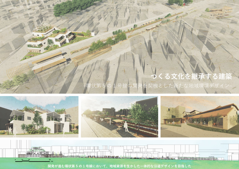 本研究は、開発事業が人の想いを裏切る形になってしまうことへの危機感から始まりました。本研究では都市計画道路事業に着目し、開発がされる沿道において、地域資源を活用し、道路空間と沿道の建築を一体的に計画することで、地域の文化を残しつつ、新しい地域環境の創成を目指しました。